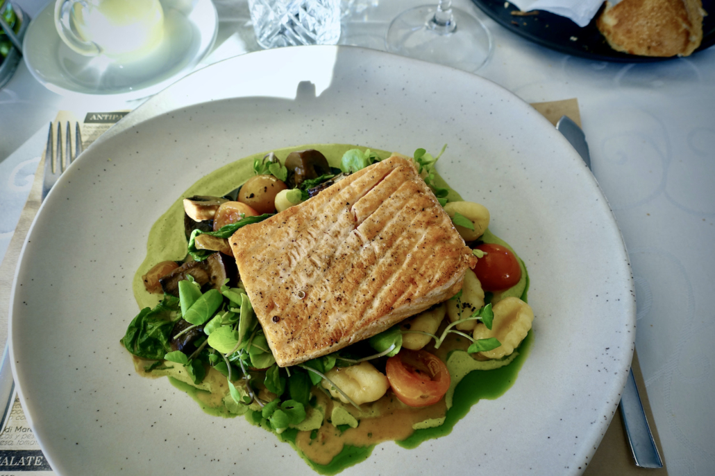 My husband and I went for a salad with pears and Gorgonzola cheese as well as Burrata with a tomato variation, red pesto and olives as starters. And wow, both dishes could have passed as mains, they were huge. My advice is to share one starter for two persons. Then we ordered Salmon & Gnocchi